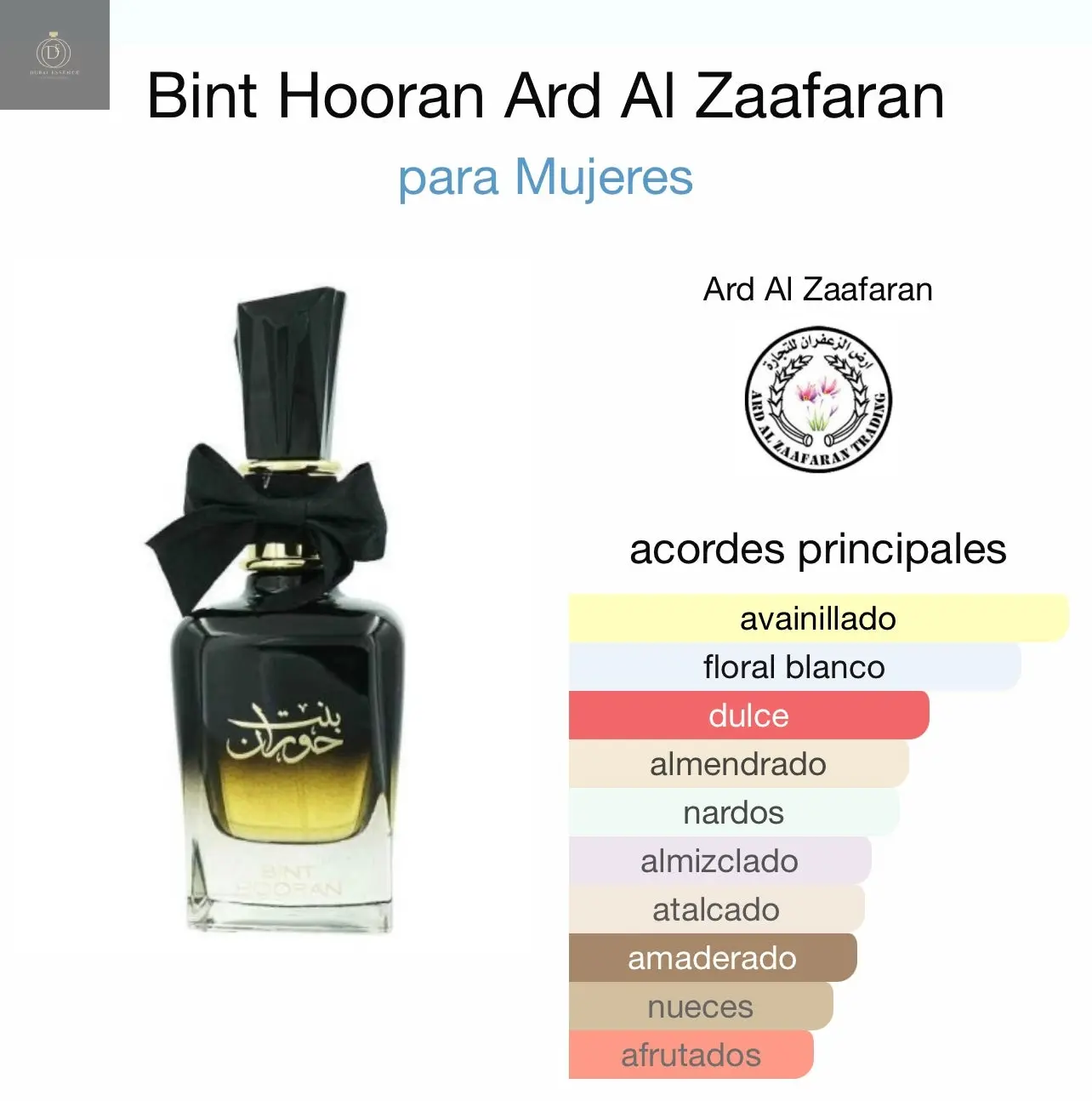 Bint Hooran Bint Hooran es un perfume brillante, rico y sensual, ideal para eventos nocturnos o celebraciones que te sacan de lo cotidiano y ofrecen una experiencia de fragancia única y exótica. Imagina cómo puede ser tu velada con este perfume: es verdaderamente un perfume que te permite destacar y crear un recuerdo único.